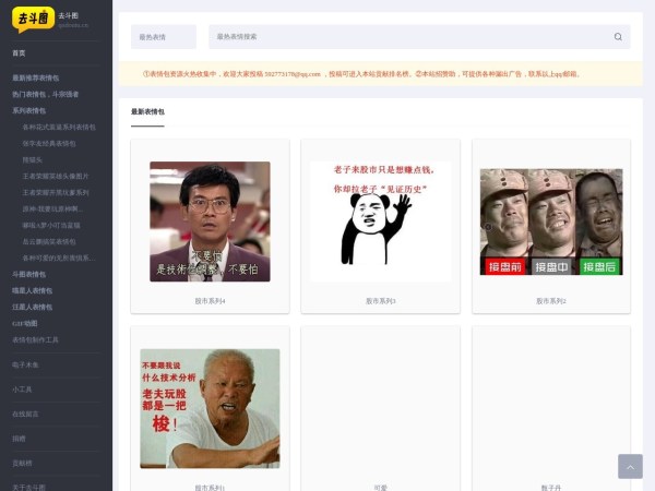 一家整理分享网络表情包的网站。包括热梗图,抖音热门、斗图、搞笑、金馆长、聊天、怼人、游戏、动图gif表情包等各类表情包和图片。