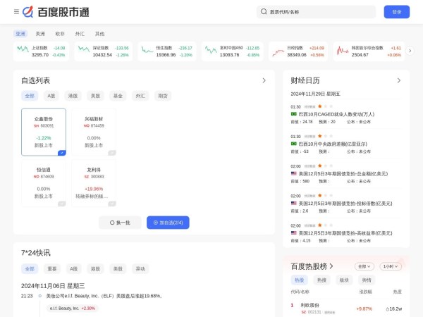 百度股市通,汇聚全球金融市场的股票、基金、外汇、期货等实时行情,7*24小时覆盖专业财经资讯,提供客观、准确、及时、全面的沪深港美上市公司股价、财务、股东、分红等信息,让用户在复杂的金融市场,更简单的获取投资信息。