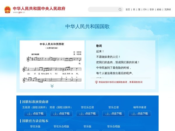 本页面提供中华人民共和国国歌即《义勇军进行曲》资料,包括国歌简谱、国歌五线谱、国歌齐唱版音频、国歌管乐合奏音频、国歌高清视频、国歌标清视频相关内容在线预览、视听及下载等服务,同时对中华人