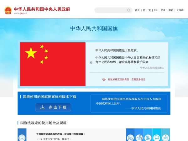 本页面提供国旗介绍和国旗图案标准版本下载服务,同时对国旗法规定的使用场合及规范、相关规定和相关资料的介绍。