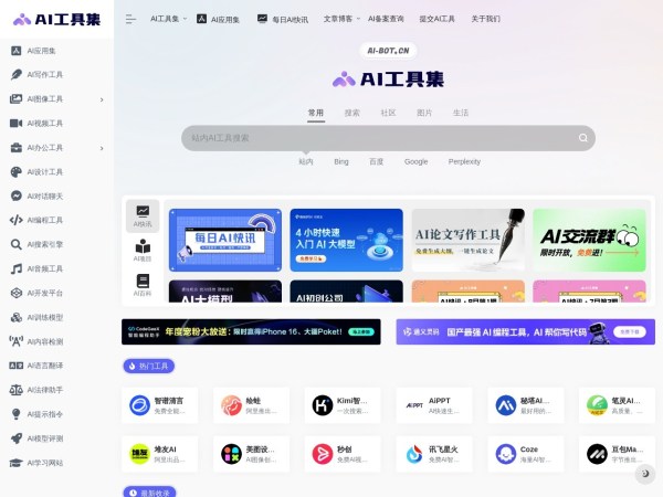 AI工具集导航收录了国内外数百个AI工具,包括AI写作工具、AI图像工具、AI视频工具、AI音频工具、AI编程工具、AI音乐工具、AI设计工具、AI对话工具等AI工具大全,以及AI学习开发的常用网站、框架和模型,帮助你