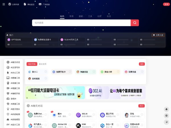 收录国内外数百个AI工具,包括AI写作工具、AI图像生成和背景移除、AI视频制作、AI音频转录、AI辅助编程、AI音乐生成、AI绘画设计、AI对话聊天等AI工具集合大全