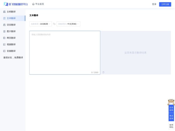 讯飞智能翻译平台是专业的在线文档翻译平台,提供PDF/Word/Excel/PPT文件翻译、图片识别翻译、在线翻译等服务,支持22种文档格式以及60多种语种和中文互译,译文结果高度还原原文样式排版。涵盖期刊论文、法律、金