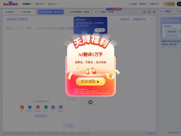 讯飞智能翻译平台是专业的在线文档翻译平台,提供PDF/Word/Excel/PPT文件翻译、图片识别翻译、在线翻译等服务,支持22种文档格式以及60多种语种和中文互译,译文结果高度还原原文样式排版。涵盖期刊论文、法律、金