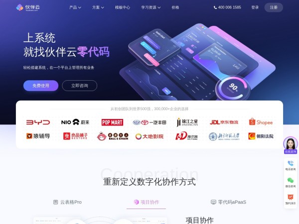 伙伴云平台,企业微信战略投资伙伴云,帮助企业5分钟完成应用搭建的零代码平台,对外连接微信用户,对内企微办公协同,使团队高效协作,开发者绿色通道,便于快速获取平台内外数据和服务