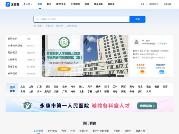医直聘医疗人才网是中国医疗领域专业的卫生人才招聘网站,提供最新最全的医院招聘信息,为公立医院、民营医院、社区卫生服务中心、诊所药房等提供医生招聘、护士招聘、医生猎头、医疗招聘会等人力资源服