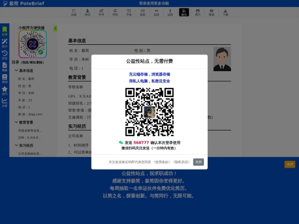极简简历是polebrief简历,一个专业免费的个人简历制作平台,在线简历引领者,带给你不一样的体验,拥有专业简历模板,为求职者提供专业极简的简历模板,三分钟制作一份简历,可随时随地将在线制作的简历下载为图片、PDF、Word格式文件。