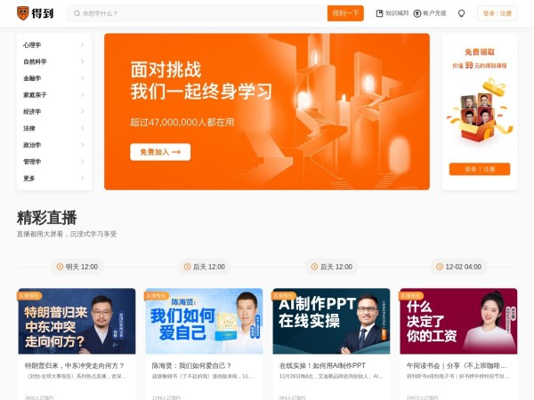 搜索感兴趣的知识,学习相关课程、电子书、听书。罗振宇·罗辑思维、薛兆丰·经济学、武志红·心理学、张明楷·刑法学等100多位专家学者的独家课程免费试读。多设备使用得到,提升你的学习效率。