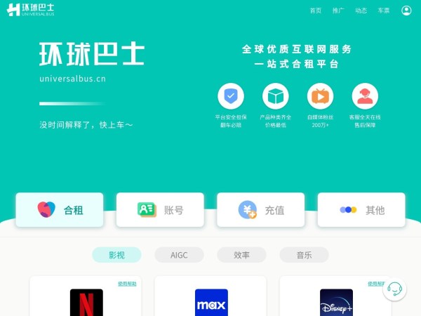 环球巴士 · 奈飞站 提供包括一站式流媒体合租平台 包括但不限于奈飞 网飞 Netfilx Spotify,Netflix,Tidal,Hbo,Hbogo,Youtube,Disney+在内的流媒体账号合租,实现自动化交付,售后无忧,发车更省心,上车更安心,价格更贴心