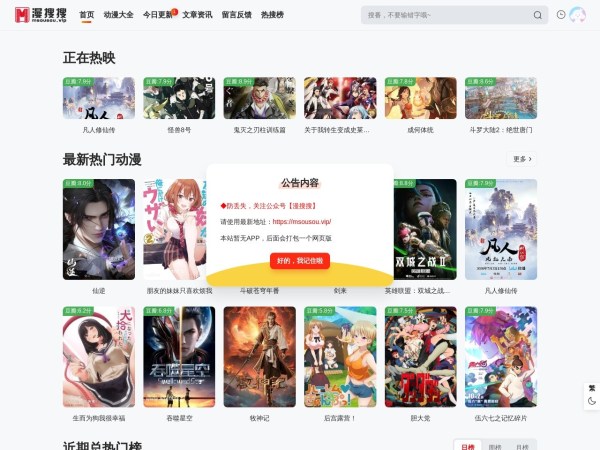 漫搜搜是一个专注于动漫播放和搜索的平台,提供丰富的动漫资源和便捷的用户体验。漫搜搜-最全动漫、番剧高清搜索,想搜就搜想看就看。免费动漫搜索网站,查找动漫资源,免费在线观看。