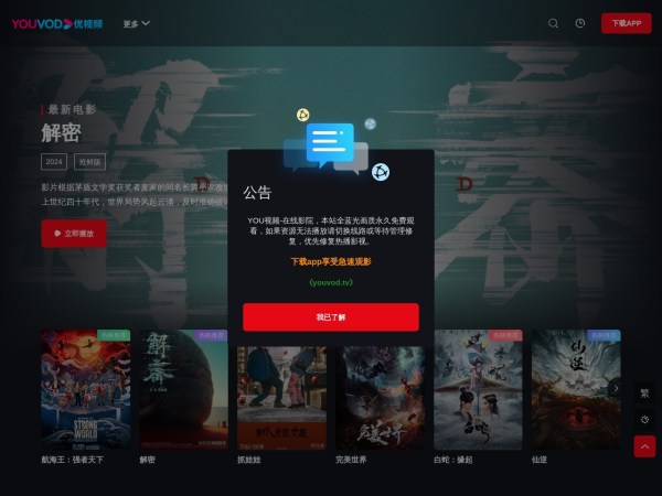 优视频是您的终极电影与视频资讯平台,提供最新电影预告、热门影片推荐、以及观众评级和详细的影评。从新上映的大片到经典老片,我们应有尽有。探索电影排行榜,轻松预约电影票,与其他影迷分享您的观影感受。选择优视频,尽享最佳观影体验!