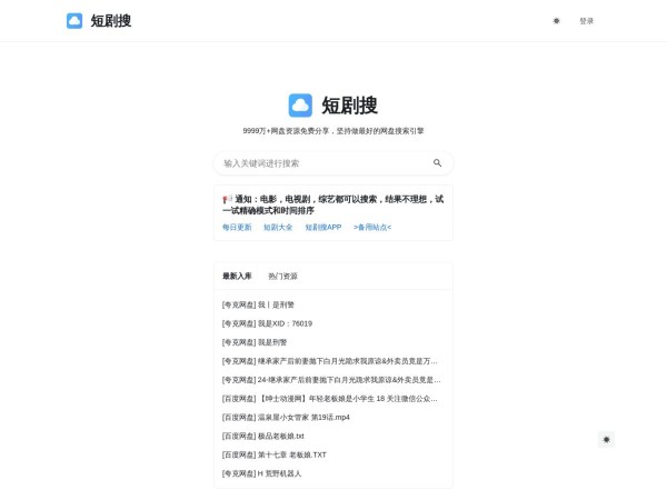 短剧搜是一款网盘搜索工具,支持百度网盘、阿里云盘、夸克云盘等网盘资源的全文检索,短剧搜索,影视搜索。