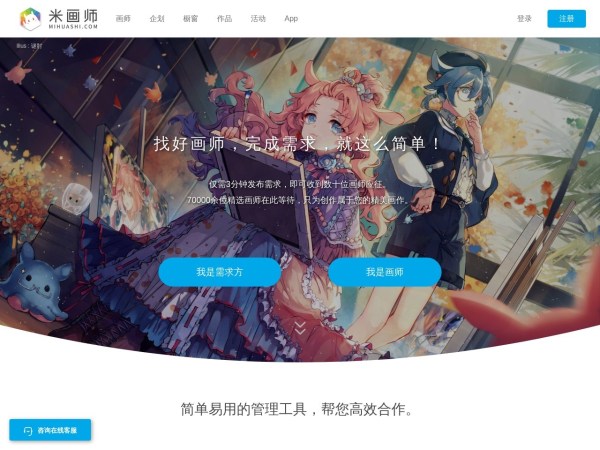 米画师是为企划方与自由画师量身打造的专业美术外包服务平台,提供安全的交易担保、高效的稿件管理工具以及便捷的云端同步功能,为您带来与众不同的约稿体验,快速解决各种美术外包需求。