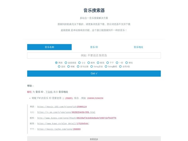 全网音乐免费下载网多站合一音乐搜索解决方案,可搜索试听免费下载网易云音乐、QQ音乐、酷狗音乐、酷我音乐、虾米音乐、百度音乐、一听音乐、咪咕音乐、荔枝FM、蜻蜓FM、喜马拉雅FM、全民K歌、5sing原创翻唱音乐、SoundCloud。