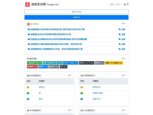 放屁网在线音乐搜索,可以在线免费下载全网MP3付费歌曲、流行音乐、经典老歌等。曲库完整,更新迅速,试听流畅,支持高品质|无损音质~