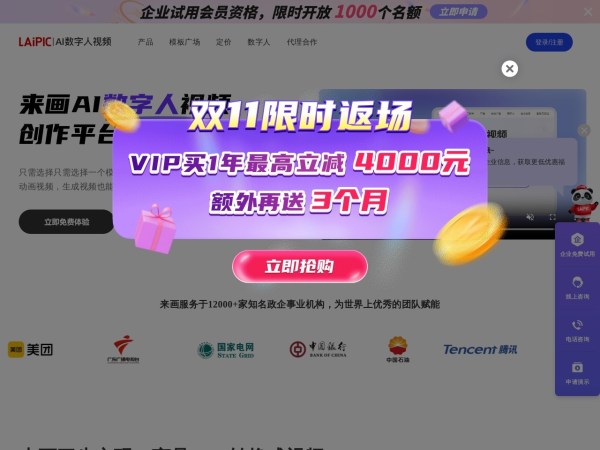 一站式数字人视频制作和直播平台,打通从“AI写作”、“AI绘画”、“AI配音”到“数字人视频制作”内容创作全流程;已为等数百家行业客户提供数字形象定制服务,提供包括“一张照片驱动”,“2.5D真人克隆”,“3D定制及IP活化”等多种数字形象克隆方案;告别真人录制,使用一站式数字形象编辑器,轻松制作数字人视频和直播。