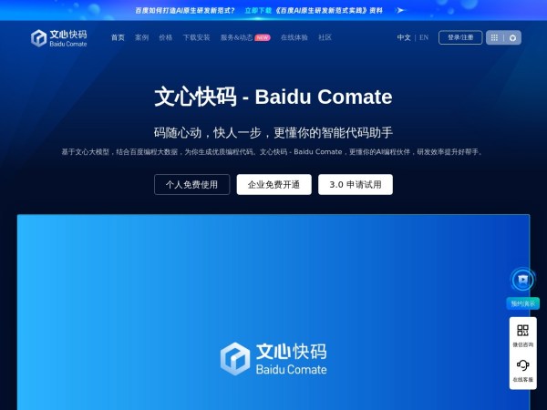 Baidu Comate 是由百度研发的智能编码助手。基于文心大模型,结合百度积累多年的编程现场大数据和外部优秀开源数据,为你生成更符合实际研发场景的优质代码。提升你的编码效率,释放“十倍”软件生产力。