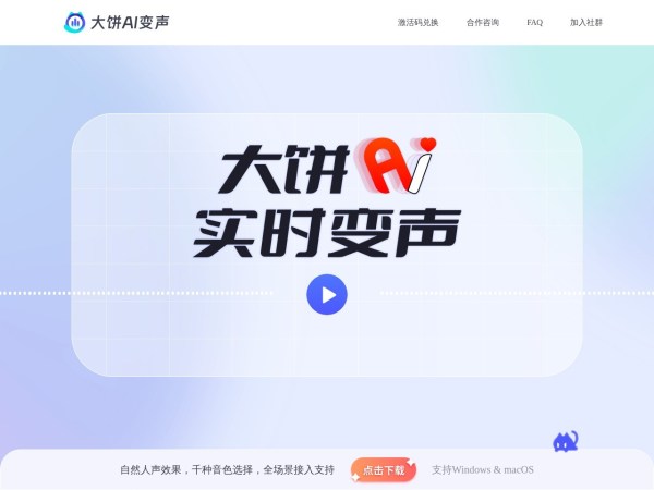 大饼AI变声,WIndows&Mac免费下载,有态度、有感情的AI变声器,IP音效、御姐萝莉,正太萌妹,千百种丰富音色免费试用,一键安装轻松上手,支持全平台游戏、直播、软件内使用