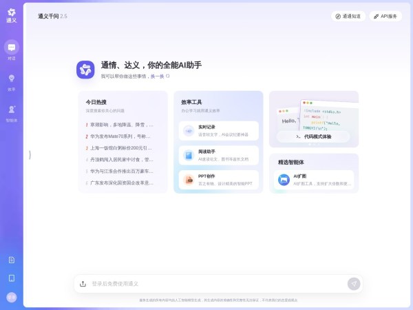 通义是一个通情、达义的国产AI模型,可以帮你解答问题、文档阅读、联网搜索并写作总结,最多支持1000万字的文档速读。通义tongyi.ai_你的全能AI助手