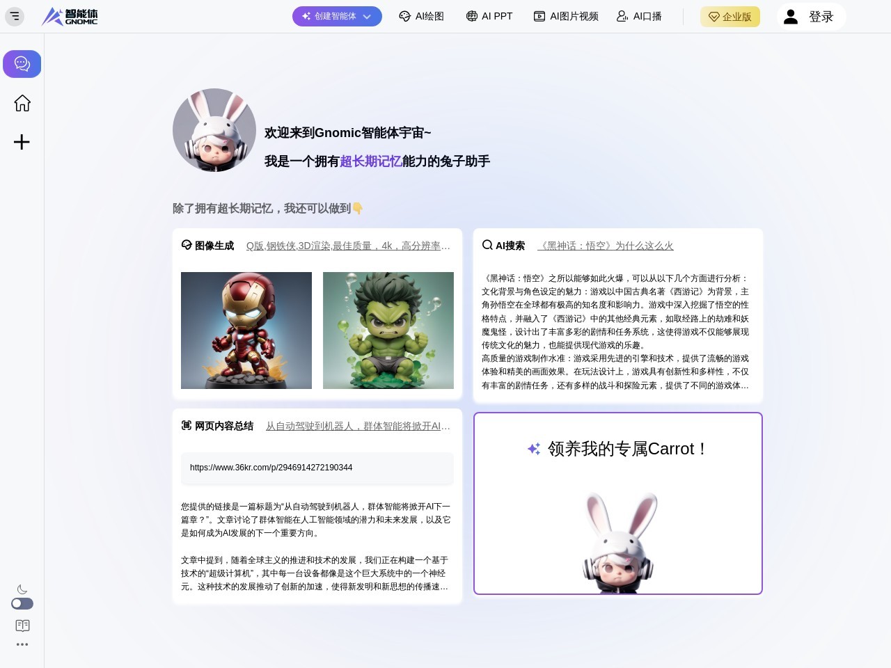 Gnomic智能体平台,基于汇智智能自主研发的Carrot AI大模型和专利的“数字生命”技术,致力于提供最先进的人工智能交互体验;并面向企业、协会、组织等各类型B端用户,提供深度定制化的智能体解决方案。