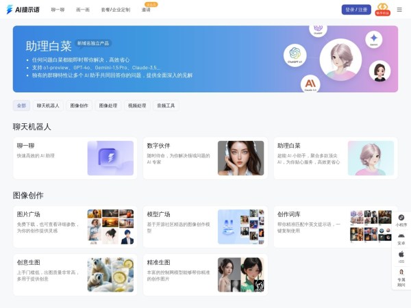 收录国内外数百个AI工具,包括AI写作工具、AI图像生成和背景移除、AI视频制作、AI音频转录、AI辅助编程、AI音乐生成、AI绘画设计、AI对话聊天等AI工具集合大全