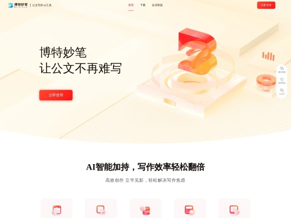 博特妙笔,由人工智能技术厂商博特智能公司推出的国内首款生成式公职人员AIGC写作工具,集合了范文参考资料、写作素材、智能写作、校对纠错、润色续写、笔杆社区、专家代笔等功能服务。适用于公职人员、