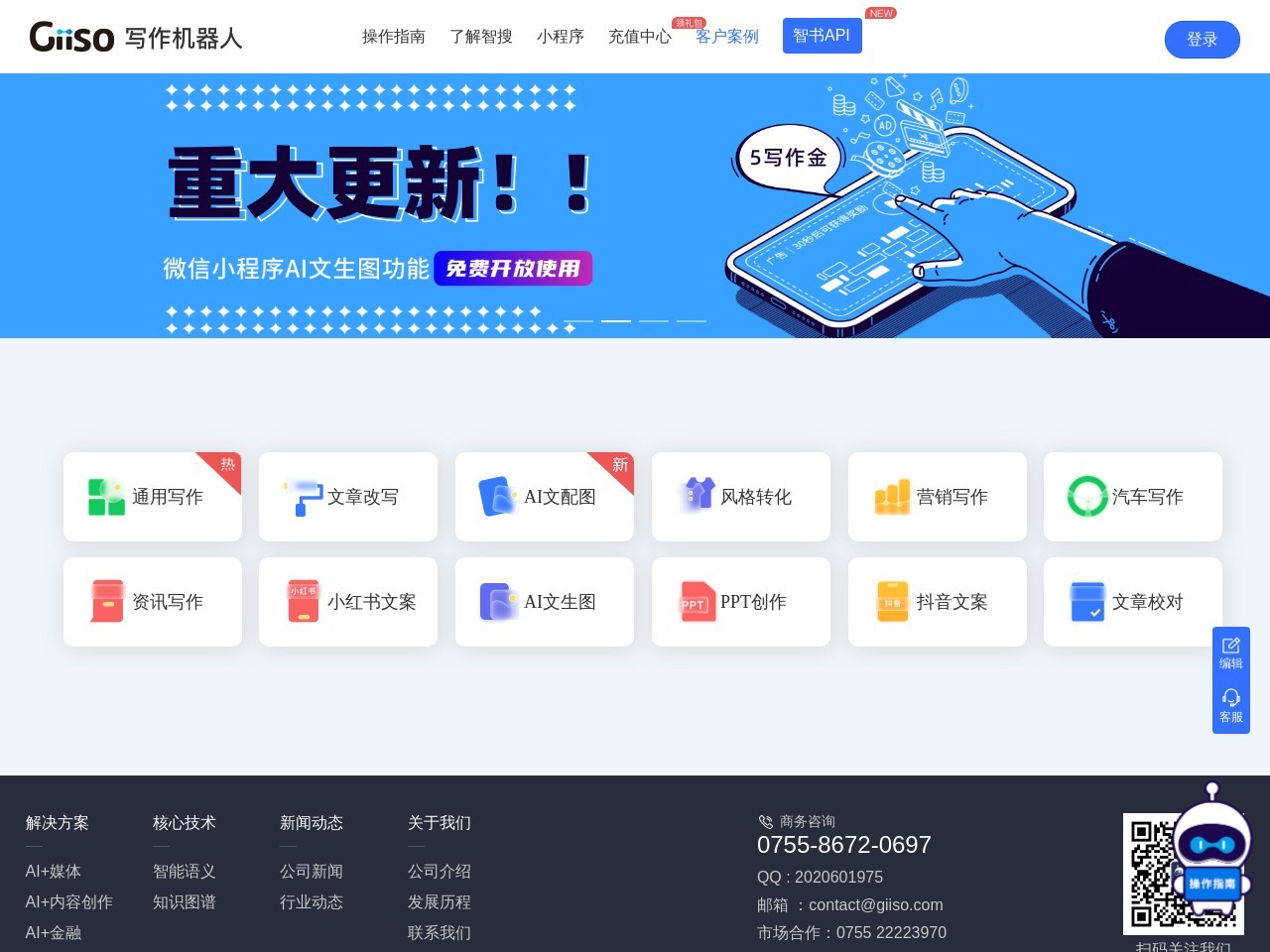 Giiso写作机器人,一款内容创作AI辅助工具,提供热点写作、提纲写作、汽车写作等类型写作,具备智能写作、智能推荐素材、稿件改写、稿件查重、稿件纠错等功能,是自媒体、新媒体写作的好帮手。