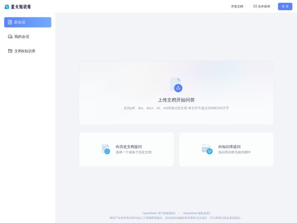 讯飞星火知识库文档问答,是科大讯飞基于讯飞星火大模型和星火知识库搭建的文档问答服务,能够高效检索文档信息,准确回答专业问题。具备多文档问答,文档知识库,信源原文定位,文档总结,自定义切分等功能。