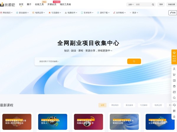 资源吧(www.ziyuanba.cn)为您免费分享网创教程和网创项目、网创经验、创业交流、副业经验交流等,整合了中创网无水印冒泡网赚知识付费VIP创业课程和自媒体、拼多多、淘宝电商营销教程、短视频抖音快手教程、源码、软件等,找项目副业资源就上资源吧!