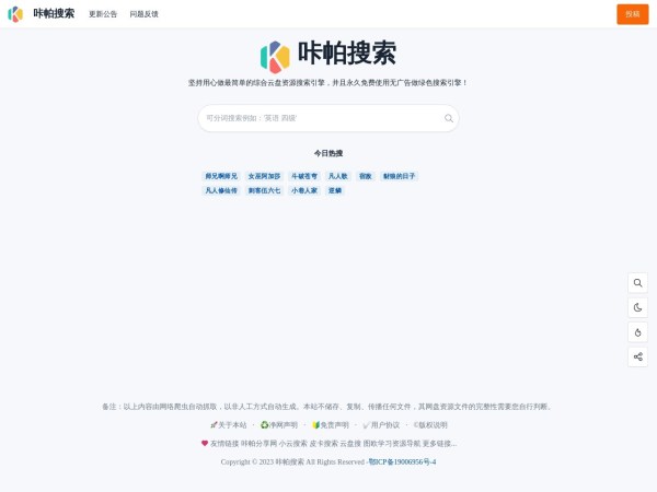 咔帕搜索(www.CuppaSo.fun)是一个资源超丰富的云盘资源搜索网站,咔帕搜索专注于收录夸克云盘,阿里云盘,百度云盘,迅雷云盘,天翼云盘,彩和云盘,蓝奏云盘资源,包括:影视资源、音乐资源、图片资源、电子书资