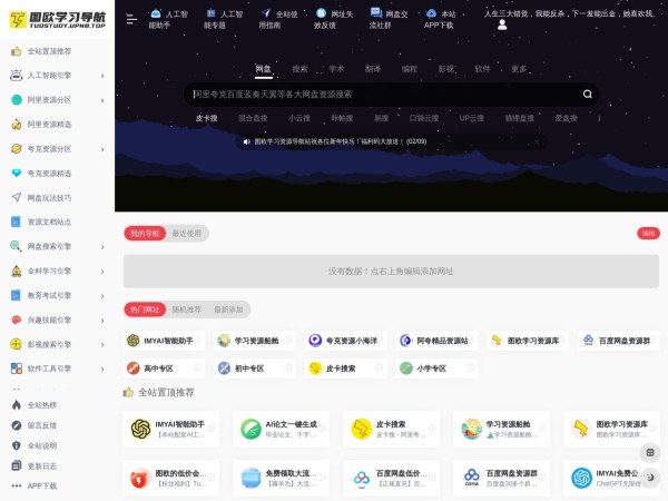 一家聚合了全网资源的网址导航网站,只需要一个网站就可以拥有全网的优质资源,一个网站在手,全网精彩尽收眼底,在这里用户可以找到想要的所有资源,免费学习资源,免费影视资源,免费音乐资源,免费工具资源,免费网站资源等,聚资源网站还有一键聚合搜索引擎,一键搜索自己想要的资源。