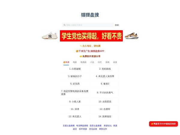 网盘资源搜索 | 百度云搜索_夸克网盘搜索_阿里云资源是一个网盘搜索引擎,可以搜索百度网盘、115云盘、城通网盘、夸克网盘、阿里云盘等资源