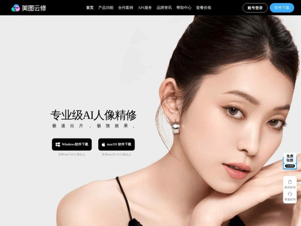 美图云修是美图公司旗下一站式AI修图软件解决方案,商业摄影行业领先的影楼智能修图软件,功能齐全操作便捷一键精修完成后期工作,AI修大片.