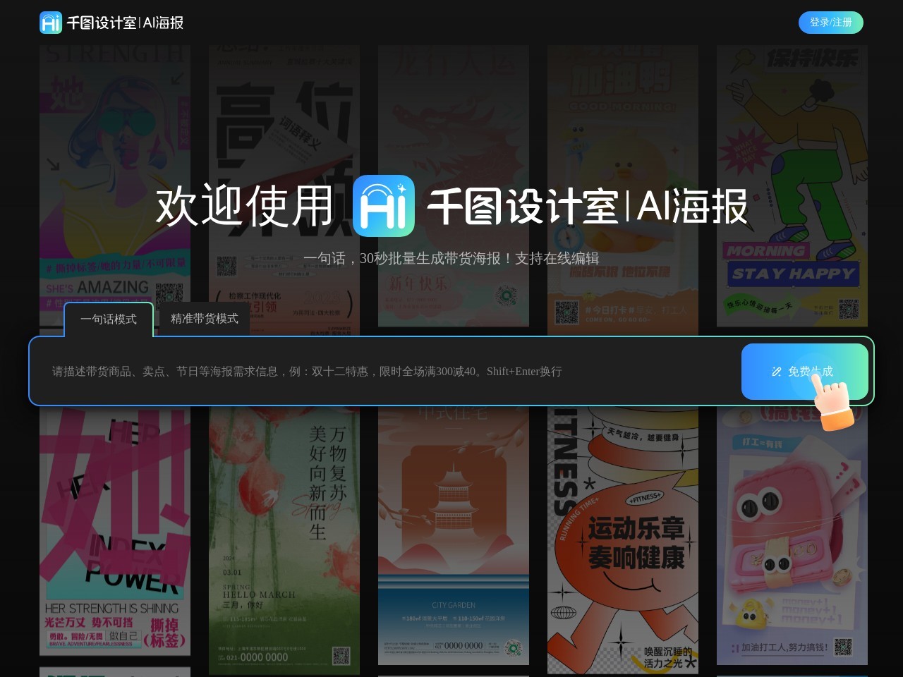千图设计室AI海报是千图网旗下的智能海报在线设计平台,提供免费AI智能海报生成,只需输入一句话,即可快速生成各种节日海报,日签,邀请函,电商主图,公众号配图,喜报,倒计时等模板生成。一键可生成多种设计风格美图,满足您的个性化需求,快速稿定设计需求。