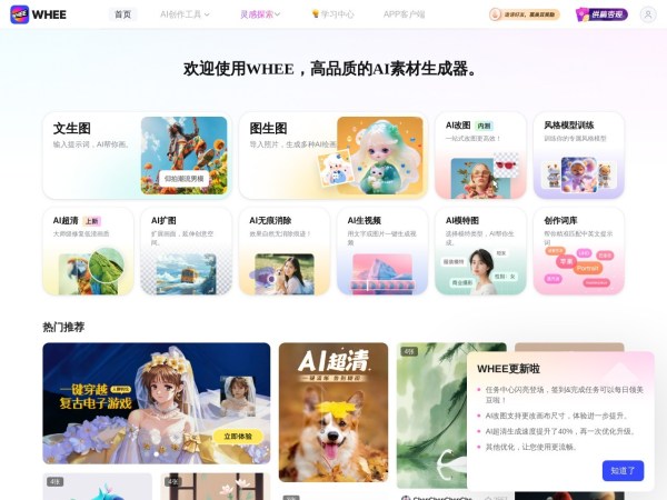 WHEE是一款AI绘画与图片生成器,提供一站式AI视觉创作服务。WHEE不仅会画也会修图,各种AI修图功能一应俱全。使用门槛低,用户只需用自然语言表述需求,就能轻松上手。在画廊中,用户可以欣赏并学习来自多
