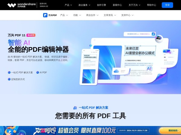 万兴PDF编辑器是A股上市公司万兴科技旗下产品,它的前身是PDFelement,是一款专业的PDF编辑器。万兴PDF拥有PDF文字编辑、PDF格式转换、PDF文档注释和阅读等多种功能,让PDF编辑像Word一样简单。