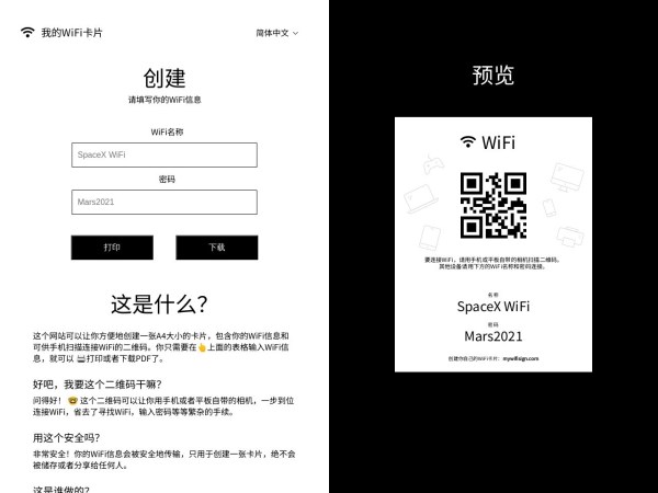 My WiFi Sign,极好用的工具!网站可以让你方便地创建一张A4大小的卡片,包含你的WiFi信息和可供手机扫描连接WiFi的二维码。