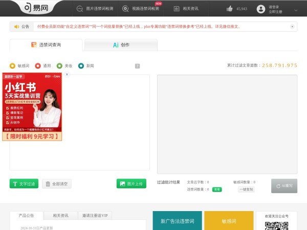 一个最新广告法淘宝违禁词敏感词在线查询检测工具,提供最新广告法违禁词在线过滤工具,适用于各类房地产,医疗等行业文案新闻稿检查,词库包含各类禁语极限用语。