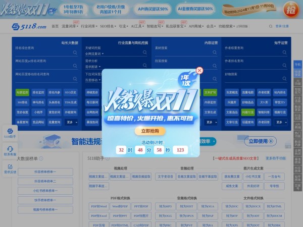 5118营销大数据通过提取、分析互联网大数据,为网站运营人、排名从业人员、新媒体从业者提供有价值的专业分析结果及指引,让用户可以迅速提升网络运营能力。