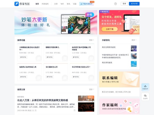 致力于原创作家孵化、培育、创作、挖掘的网络文学平台,作家可以通过作家学院在线课程的学习,使用作家专区及作家助手移动端APP发布与管理小说、查看数据、与读者互动。