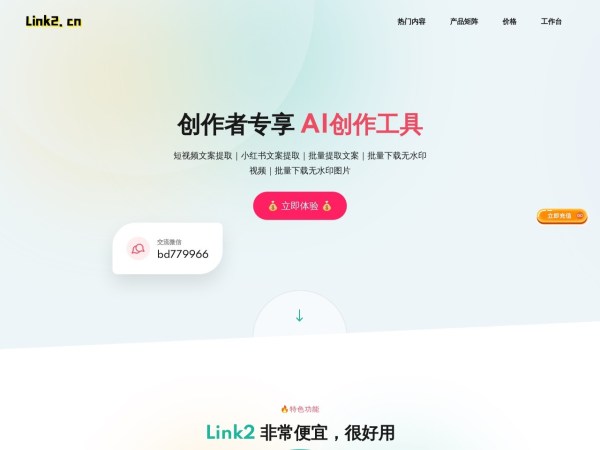 Link2是专为内容创作者设计的神器,提供轻松快捷的短视频文案提取和无水印下载功能。不仅支持批量提取小红书文案,还能一键提取各种短视频平台的文案,并且提供高效的批量无水印下载服务。节省您的时间,提高工作效率。