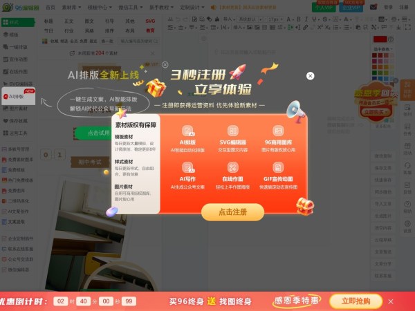 96微信编辑器是一款专业强大的微信公众平台在线编辑排版工具,96微信编辑器提供手机预览功能,让用户在微信图文文章内容排版,文本编辑,素材编辑上更加方便,在线免费使用的微信公众号编辑器。