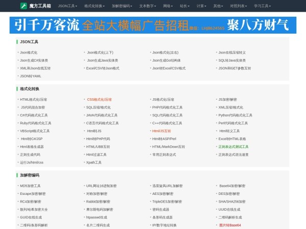 魔方工具箱为您提供json格式化,json代码压缩,json校验解析,json数组解析,json转xml,xml转json,json解析,json在线解析,json在线解析及格式化,unix时间戳转换,CSS美化压缩,json美化,json格式化输出,json数组,json实体类,json视图等