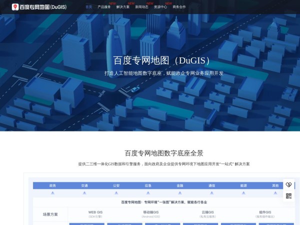 全称:百度专网地图(DuGIS),是百度地图为赋能政企客户专网应用开发推出的专网GIS产品。百度专网地图鲜活丰富的GIS大数据能力、强大的API订制开发能力、以及炫酷的GIS大数据可视化能力,可以深度赋能专网个性化