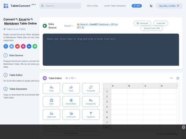 一个功能强大的在线表编辑器,支持Excel、Markdown、JSON、CSV、HTML等格式的相互转换