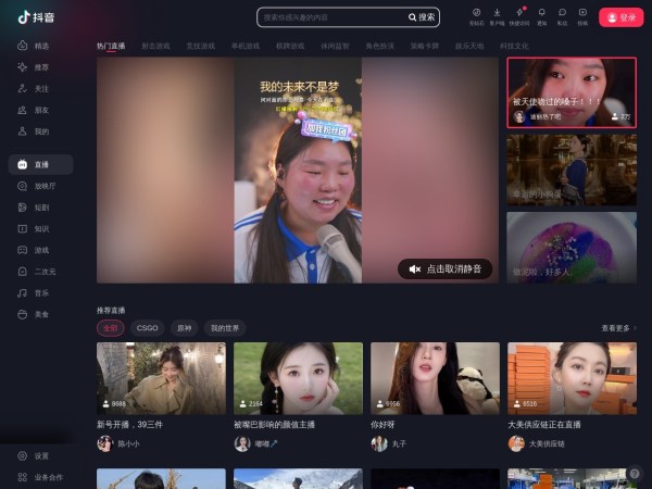 抖音直播网页版 - 抖音已经支持在电脑上看直播啦!抖音直播PC版已支持热门网络游戏、棋牌游戏、单机游戏的直播内容。抖音-记录美好生活的视频平台