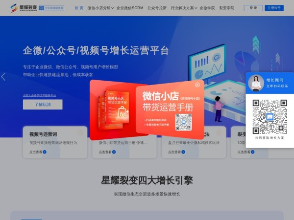 基于微信生态帮助客户实现用户裂变增长的服务商,旗下品牌产品包含星耀任务宝,企微scrm,消息通,活码,幸运签等,西安星耀网络科技有限公司提供综合性落地裂变增长方案,拥有强大的技术团队,售后服务团队及运营策划团队,帮助上万家企业实现用户增长+品牌曝光率,是微信公众号及企业微信运营推广必备工具
