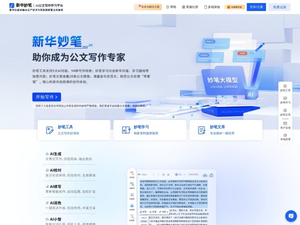 AI公文写作学习平台,由新华社媒体融合生产技术与系统国家重点实验室与博特智能公司联合研发。集查、写、审、问、学一体,集合了范文参考资料、写作素材、智能写作、校对纠错、润色续写等特色功能。帮助公务员、事业单位人员、国企人员的机关公文写作场景,快速拟稿,降低内容风险,擅长工作总结、竞聘材料、发言稿、工作简报等材料等智能写作。