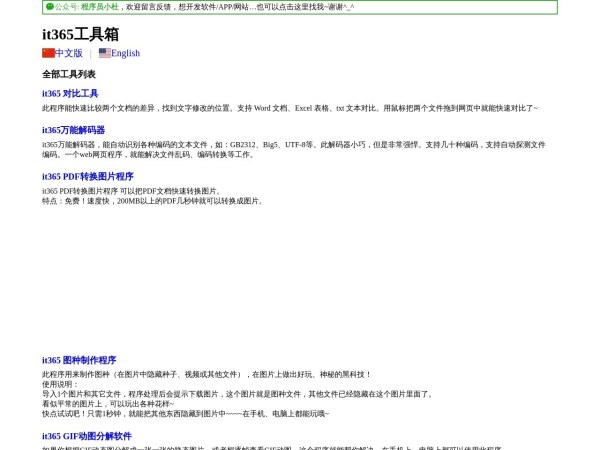 it365工具箱是一个集合了多种文本处理和文件处理工具的平台。它提供了各种实用的小程序和工具,涵盖了从文档差异对比、文本编码自动识别、图种制作、动图分解、OCR图片文字识别到迅雷链接转换器、下载链接提取工具、查询号码归属地等功能。
