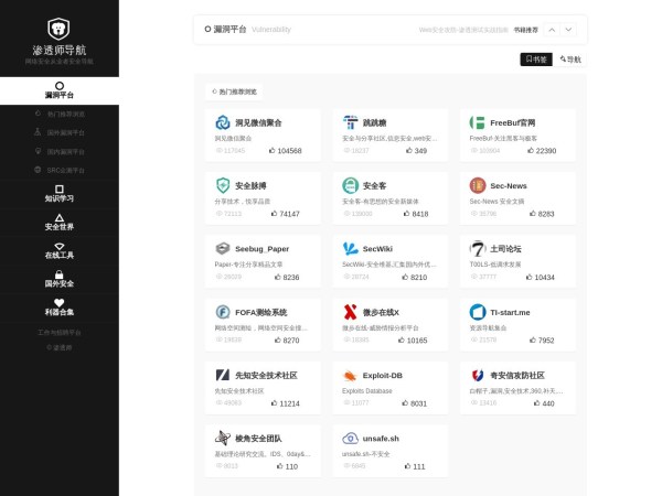网络安全导航,网络安全人员的上网导航,主要栏目有安全论坛,安全团队,漏洞库,众测平台,安全博客,安全厂商,密码破解